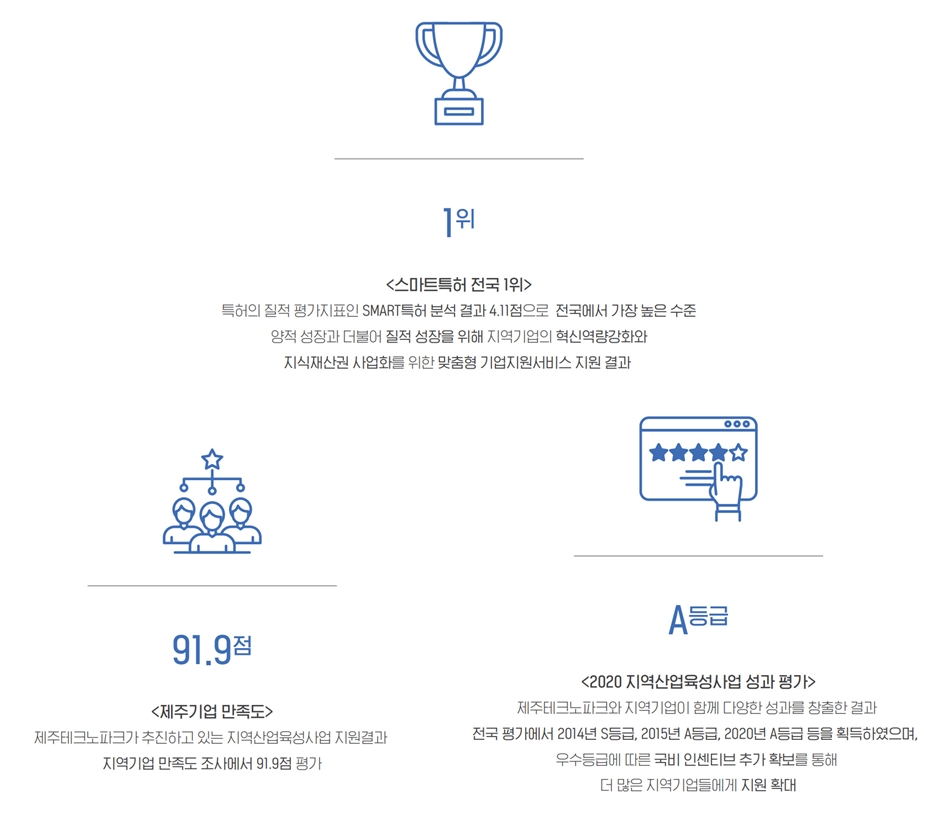 제주테크노파크가 추진하고 있는 지역산업육성사업 지원결과 지역기업 만족도 조사에서 91.9점이라는 높은 평가를 받았고, 제주테크노파크와 지역기업이 함께 다양한 성과를 창출한 결과, 전국 평가에서 2014년에 S등급, 2015년과 2020년에는 A등급을 획득하였으며, 이런 우수등급에 따른 국비 인센티브 추가 확보를 통해 더 많은 지역기업들에게 지원을 확대하는 효과를 가져 오기도 했습니다.