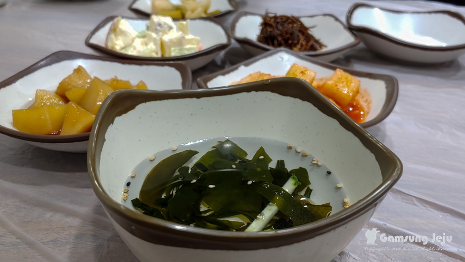 식초가 들어가 새콤한 미역국입니다. 매운 아구찜에 곁들이면 조금 중화되는 느낌이 듭니다.