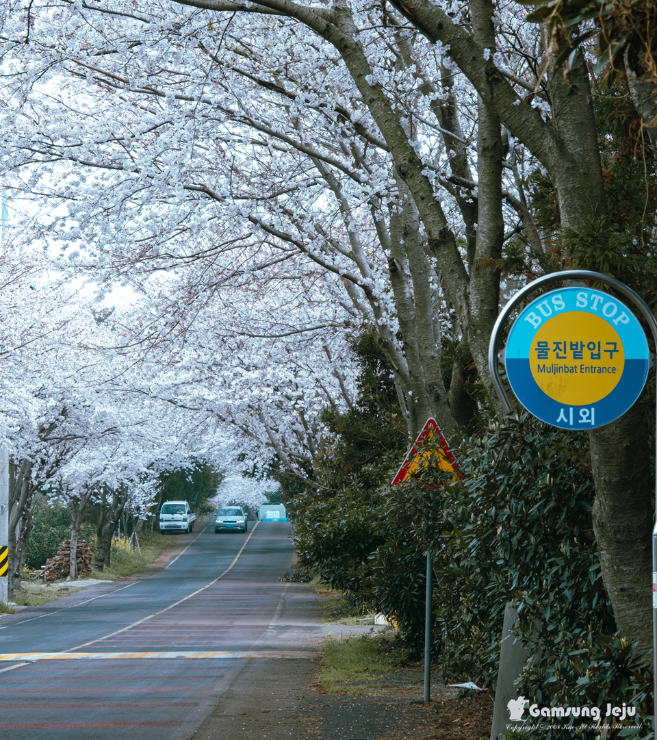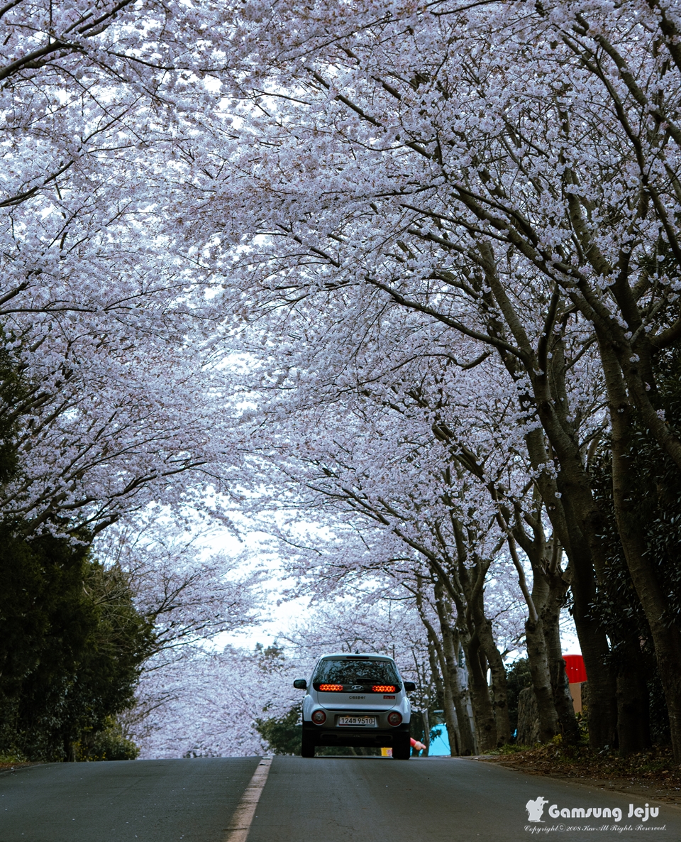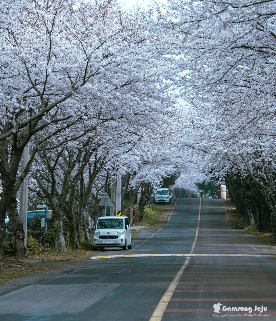 삼달리는 김영갑 갤러리로 알려진 마을이기도 합니다. 일주도로에서 진입하면 김영갑 갤러리 가기 전, 중산간 쪽에서 진입하면 갤러리를 지나서 조금만 해안 방향으로 내려가면 벚꽃 터널을 만날 수 있습니다.